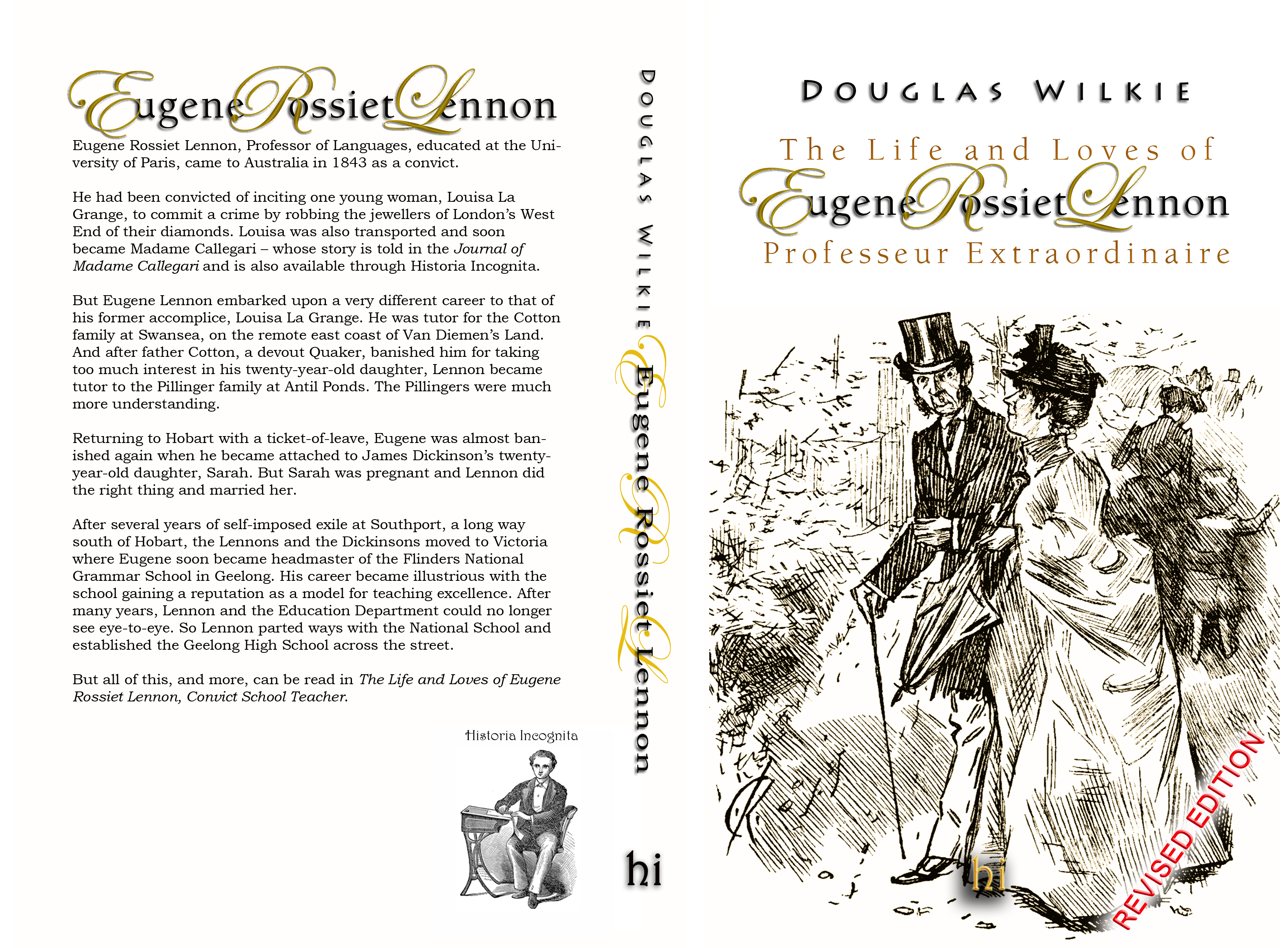 Eugene Rossiet Lennon, Professor of Languages, educated at the University of Paris, came to Australia in 1843 as a convict. He had been convicted of inciting one young woman, Louisa La Grange, to commit a crime by robbing the jewellers of London’s West End of their diamonds. Louisa was also transported and soon became Madame Callegari – whose story is told in the Journal of Madame Callegari and is also available through Historia Incognita. But Eugene Lennon embarked upon a very different career to that of his former accomplice, Louisa La Grange. He was tutor for the Cotton family at Swansea, on the remote east coast of Van Diemen’s Land. And after father Cotton, a devout Quaker, banished him for taking too much interest in his twenty-year-old daughter, Lennon became tutor to the Pillinger family at Antil Ponds. The Pillingers were much more understanding. Returning to Hobart with a ticket-of-leave, Eugene was almost banished again when he became attached to James Dickinson’s twenty-year-old daughter, Sarah. But Sarah was pregnant and Lennon did the right thing and married her. After several years of self-imposed exile at Southport, a long way south of Hobart, the Lennons and the Dickinsons moved to Victoria where Eugene soon became headmaster of the Flinders National Grammar School in Geelong – today known as the Matthew Flinders Girls Secondary College. His career became illustrious with the school gaining a reputation as a model for teaching excellence. After many years, Lennon and the Education Department could no longer see eye-to-eye. So Lennon parted ways with the National School and established the Geelong High School across the street. But all of this, and more, can be read in The Life and Loves of Eugene Rossiet Lennon, Professeur Extraordinaire.
