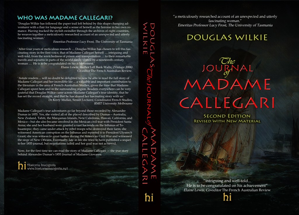‘Douglas Wilkie has solved a literary puzzle that has stumped readers on and off for more than 150 years: Who is the author of The Journal of Madame Giovanni? The travel book was published in 1855 by Alexander Dumas and generated immediate curiosity about the author, who admits to using a pen name. Some critics deemed the work to be fiction, whereas others recognized that the circumstantial detail and observations offered by the author spoke to a genuine account rather than a cut-and-paste job by an armchair traveler. Some thought the author might be Dumas’s friend, the Countess Poilloue de Saint-Mars (whose own pen name was ‘Countess Dash’), a writer from the Dumas literary stable, or perhaps Dumas himself. Although she had legitimate reasons for using a pseudonym, in later life Mrs. Pietro Callegari acknowledged she had written the popular account of her travels in the Antipodes, Hawaii, California during the Gold Rush, and in Mexico, and the United States.