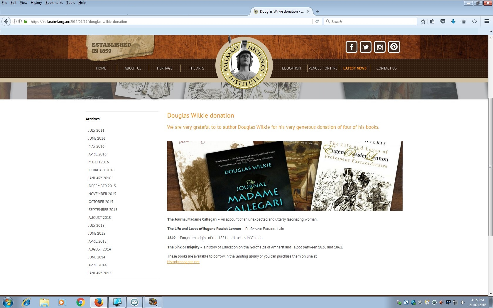 Education in the Sink of Iniquity is in the Central highlands Libraries at Ballarat and Maryborough, the Prahran Mechanics Institute Library, the Ballarat Mechanics Institute Library, as well as the State Library of Victoria and the National Library of Australia.
